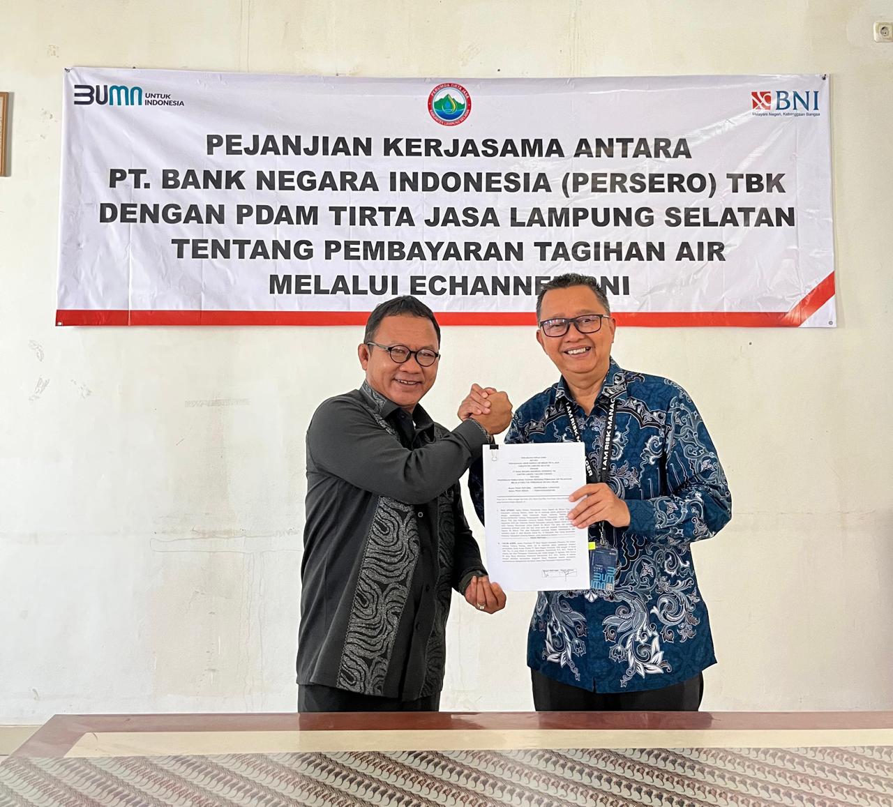 Penandatanganan perjanjian kerja sama itu dilakukan langsung oleh Branch Manager PT BNI Tbk Lampung, Yakub Azwir, bersama Direktur Perumda Tirta Jasa Lampung Selatan, H. Rudi Apriadi KM, S.Sos di Kalianda, yang turut disaksikan jajaran dari kedua pihak.